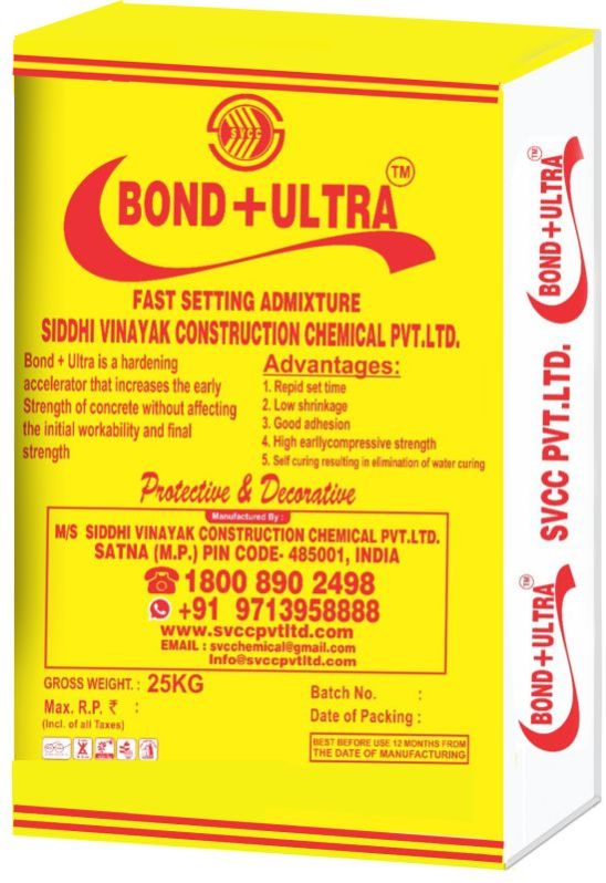 Bond + Ultra fast setting admixture is a hardening accelerator that increases the early strength of fly ash bricks without affecting the initial workability and final strength. Bond + Ultra is used as accelerator in hardening process of fly ash bricks, leading to quick set and to get high initial strength in fly ash bricks.